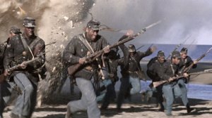 But afterwards, those bells turn into a death knell as things go badly and the central characters start to fall; in the track “Charging Fort Wagner“, cymbals clash, the vocals become noticeably more piercing, and we even hear a sort of rhythmic chanting as all of this definitely suggests danger and the “death bells” become difficult to ignore. However, things soon change again as the men charge forward and, for a time at least, things appear more hopeful and optimistic; the music becomes quicker and it all reaches a bold crescendo, after which the charging soldiers are faced with, and freeze when they see, a great host of enemy soldiers and a primed cannon aimed directly at them, at which point the music abruptly ceases and the screen cuts to white and we’re left wondering what became of our brave heroes, only to discover that many of them died and here, as we move into “An Epitaph to War“, where the recognisable theme is brought in once again, the mournful singing of the choir resumes and with this sorrowful music, we are subtly asked to “remember the fallen” and to feel something for those who lost their lives.